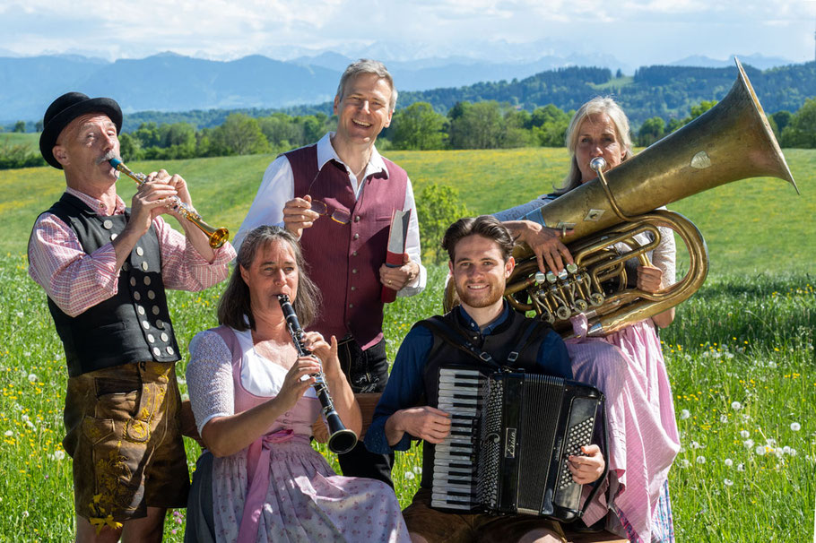Ein Hoch auf Gastlichkeit und Gaumenfreuden mit Musik in Weiß-Blau und literarischen Köstlichkeiten, aufgetischt und zubereitet von Alexander Netschajew und der 5 Seen Bladlmusi